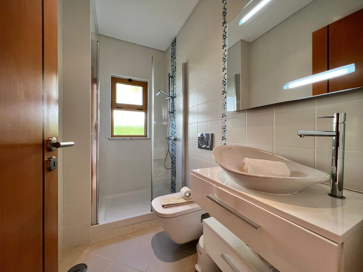 A moradia tem menos de 6 anos, está totalmente equipada e tem dois quartos suites, uma casa de banho completa, cozinha, uma sala ampla, duas varandas, uma delas com vista mar e um terraço com acesso ao jardim e à zona da piscina.