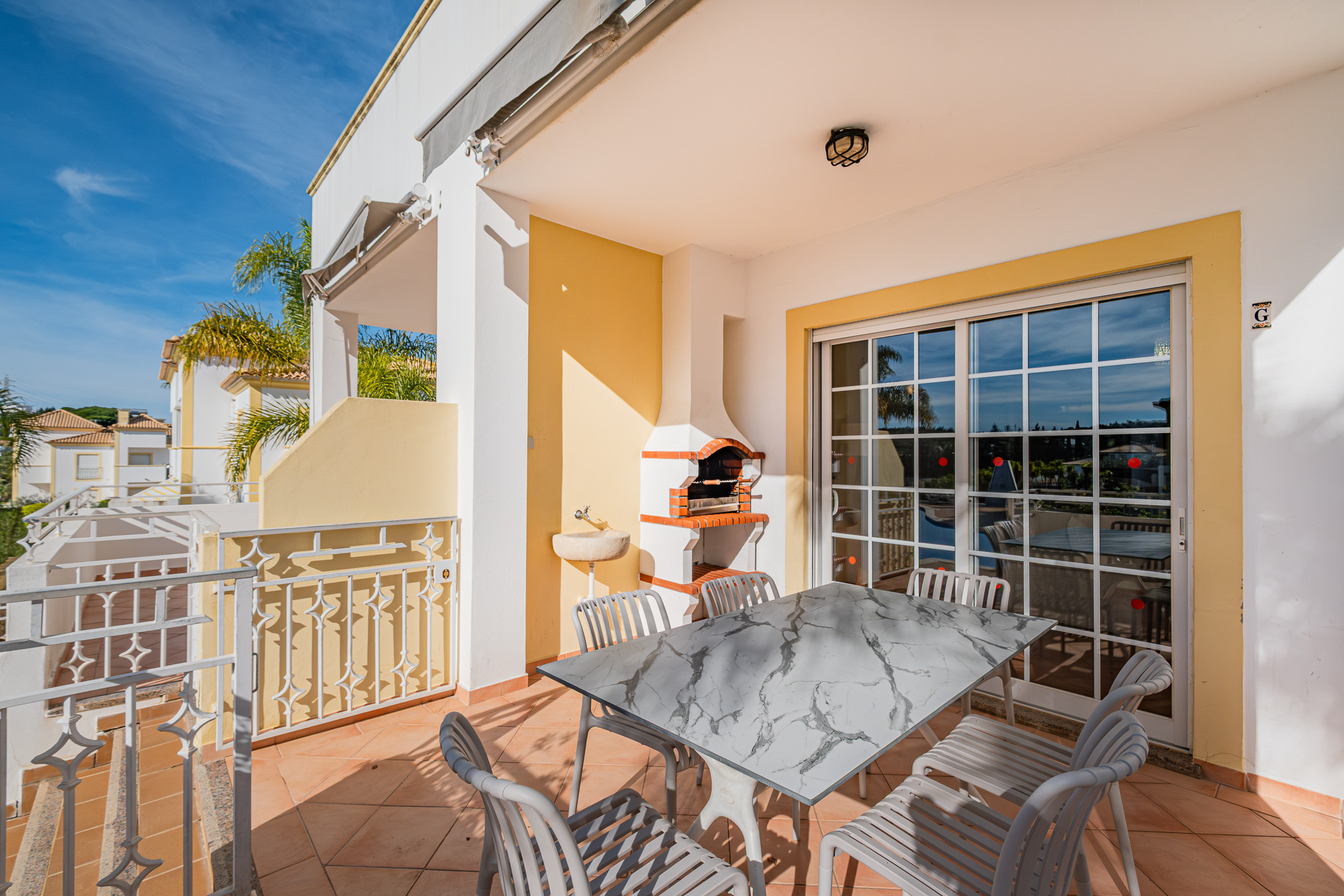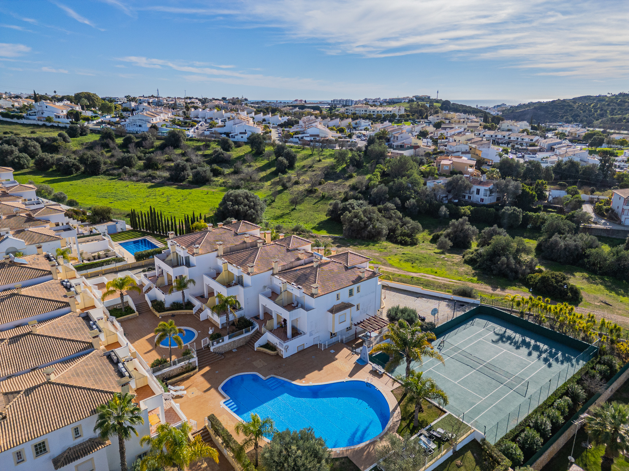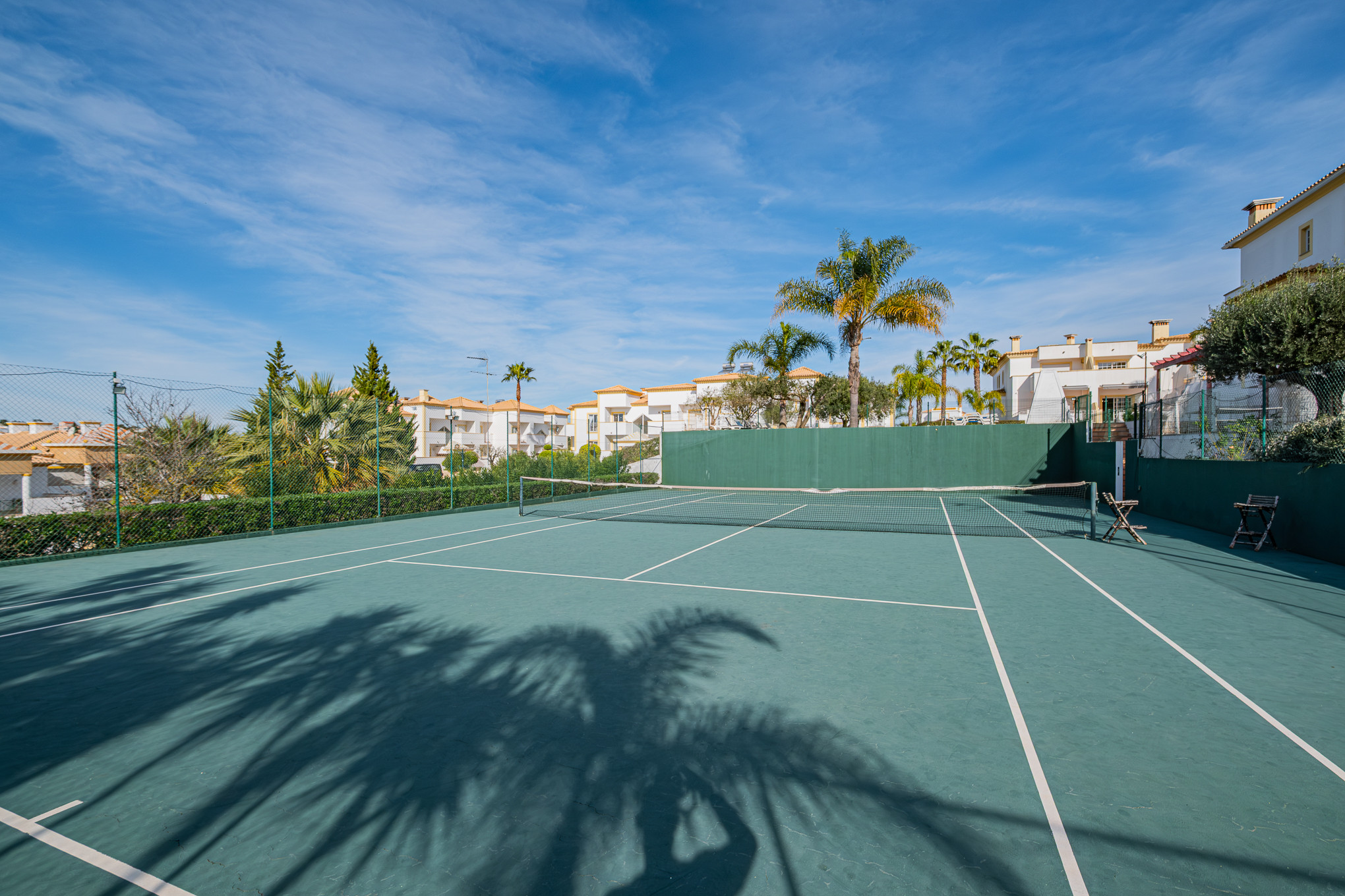 The terraced house in Albufeira has 2 bedrooms and has capacity for 6 people. The terraced house is 140 m². The accommodation is equipped with the following items: garden, garden furniture, terrace, washing machine, barbecue, fireplace, iron, safe, internet (Wi-Fi), hair dryer, tennis court, communal+children's swimming pool, open-air parking the same building, 1 TV, satellite tv (Languages: Spanish, English, French).the kitchen, refrigerator, microwave, oven, freezer, dishwasher, dishes/cutlery, kitchen utensils, coffee machine, toaster and kettle are provided.